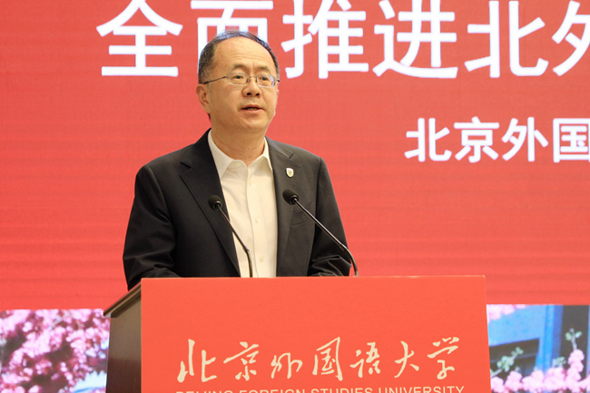 贾文键对专家组表示热烈欢迎,他围绕“学校办学定位和人才培养目标”“近年北外本科教育教学成效”等方面汇报学校本科教育教学情况。重点阐述了北外“外特精通”的办学理念,“语通中外,道济天下”的大学使命,为培养更多有家国情怀,有全球视野,有专业本领,德智体美劳全面发展的复合型人才的创新举措等。他表示,学校将根据专家组的反馈意见立行立改,推动北外本科人才培养工作再上新台阶,回答好“教育强国,北外何为”的时代之问。