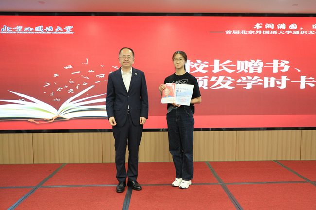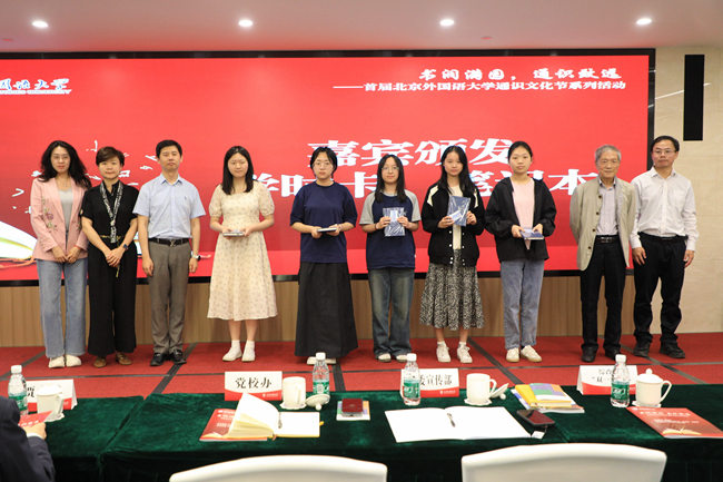 随后,贾文键同与会嘉宾分别为学生代表赠书及颁发学时卡和笔记本。