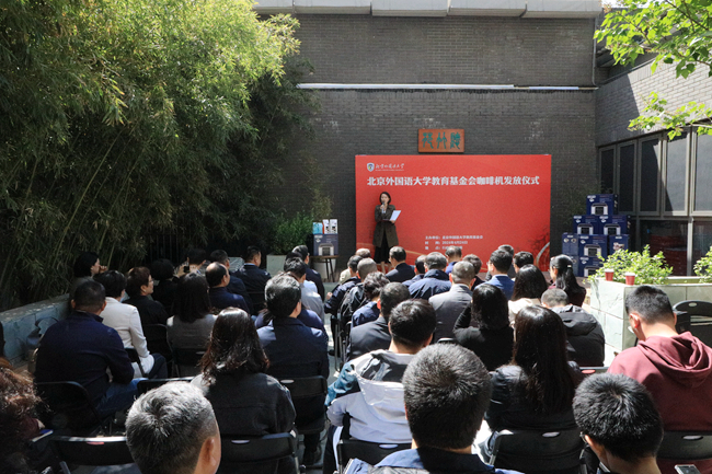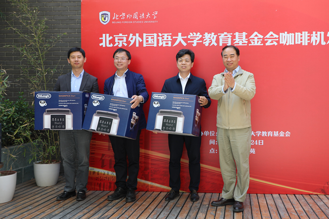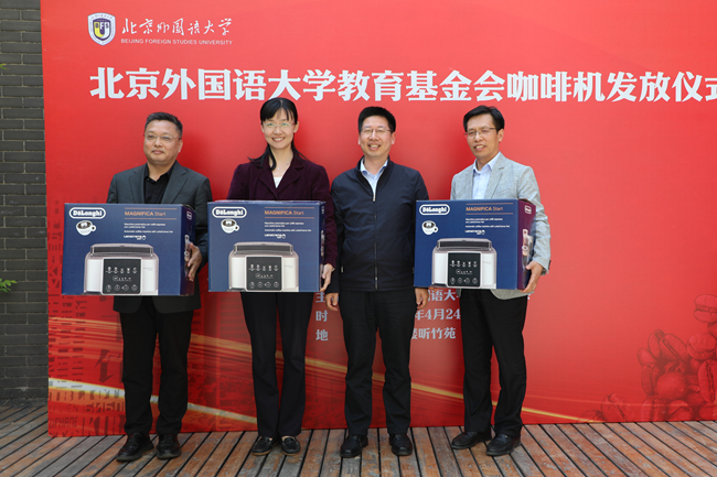 4月24日,北京外国语大学教育基金会在东校区听竹苑(教工之家)举行咖啡机发放仪式。中国社会科学院人事教育局副局长李洪雷,北外党委书记、教育基金会理事长王定华,北外党委常委、副校长贾德忠,党委副书记、纪委书记胡志钢出席仪式。仪式由校友办副主任、教育基金会秘书长姚雪主持。