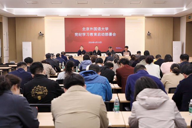 2024年4月15日,北京外国语大学召开党纪学习教育启动部署会。党委常委、副校长贾德忠,党委副书记、纪委书记胡志钢,党委常委、副校长丁浩、赵刚出席会议。会议由胡志钢主持。