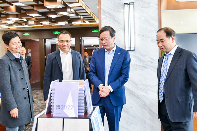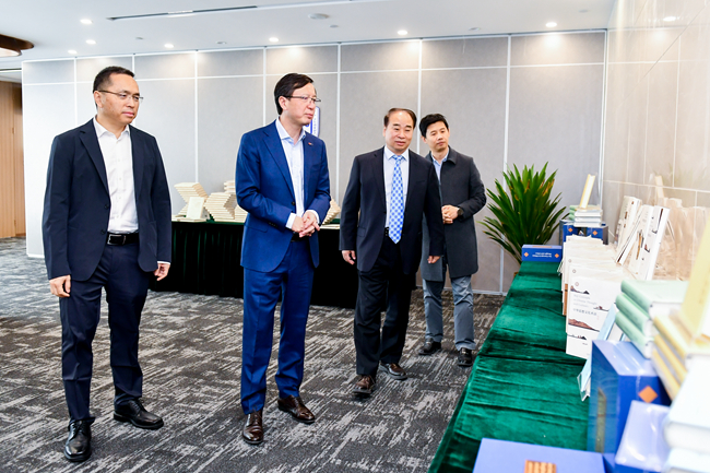 随后,陈杰来到国际大厦参观北外部分学术成果,重点了解了北外服务国家战略开展有组织科研的情况,对学校承担的《习近平总书记教育重要论述讲义》多语种版本译著、“一带一路”国家文化教育大系、中华思想文化术语传播工程,以及有关重点研究成果给予了高度评价。