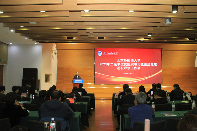 1月11日,北京外国语大学党委书记王定华召集召开2023年度二级单位党组织书记抓基层党建述职评议工作会。工作会由党委副书记、校长杨丹主持。俄语学院党总支书记黄玫,德语学院党总支书记吴江,欧洲语言文化学院党总支书记刘厚广,西班牙语葡萄牙语学院党总支书记孙眉,亚洲学院、非洲学院党总支书记许晔,中国语言文学学院党总支书记何辉,马克思主义学院党总支书记祝和军,国际中国文化研究院、历史学院党总支书记薛维华等8位党总支书记进行现场述职,其他二级单位党组织书记以书面形式述职。