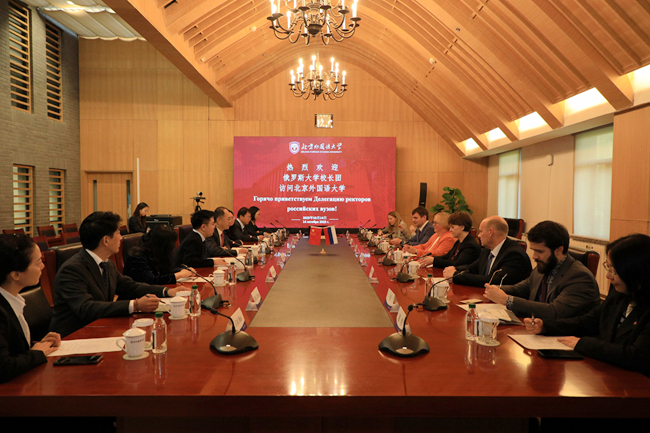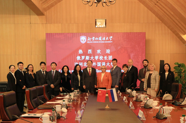 10月14日,由中国驻俄罗斯大使馆组织的俄罗斯大学校长团到访北京外国语大学。北外校长、党委副书记贾文键会见代表团一行。