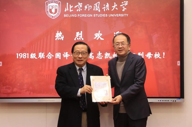 10月28日,联合国译训班1981级校友,全球化智库副主任、中国能源安全研究所所长高志凯到访北京外国语大学。北外校长、党委副书记贾文键,党委常委、副校长刘欣路会见高志凯,并与其进行座谈。座谈会由北外校友办主任、教育基金会秘书长姚雪主持。