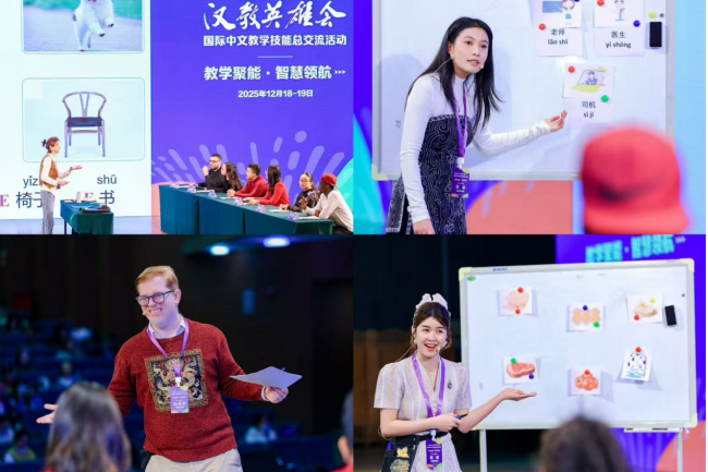 本届“汉教英雄会”以“教学聚能·智慧领航”为主题,为期两天,设有说课交流、现场教学、圆桌对话等多个环节。来自国内34所院校的36支团队结合多元文化资源与数智技术,立足语言教学主阵地,拓展文化传播、能力培养、学思并进的新维度,凝练出一系列精巧实用的教学案例。11位本土中文教师扎根海外教学实际,精准把握本土教学需求,凭借出色的专业素养、扎实的教学功底及高效的课堂互动,呈现了一堂堂轻松活跃、独具魅力的中文课堂。