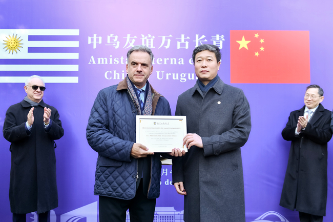 随后,奥尔西发表演讲。他表示,合作与对话是乌拉圭国家存续的基础,中国拥有长远的发展眼光,各国虽有差异但需要相互理解、认识与尊重。他深情回忆了13年前时任乌拉圭总统穆希卡栽种友谊之树的场景,并表示此次为友谊树培土,象征着对两国关系始终坚韧不拔、历久弥坚的希冀。他强调,国家间健康稳固关系的核心是相互信任,学术交流发挥着重要作用,中乌及中拉学术交流是最深层次的合作,是筑牢民心相通的根基,希望双方能汲取彼此经验,打破认知边界,以合作与对话共促和平与发展。