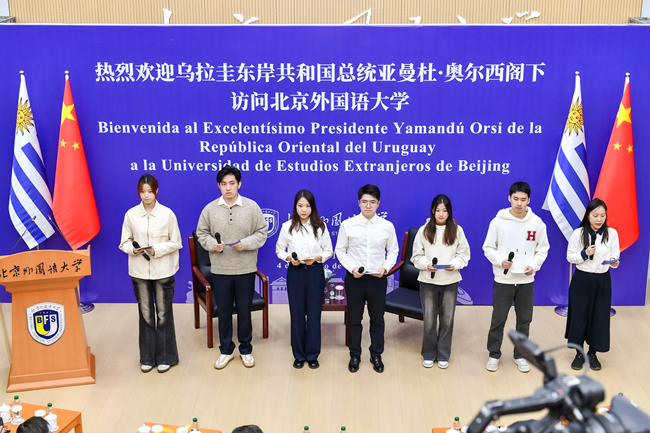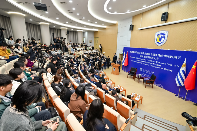 2月4日,乌拉圭总统亚曼杜·奥尔西访问北京外国语大学。北外党委书记李海,党委副书记、校长贾文键,党委常委、副校长赵刚以及中国驻乌拉圭大使黄亚中,外交部拉丁美洲和加勒比司参赞张文伟,教育部国际合作与交流司副司长张晋等出席活动。